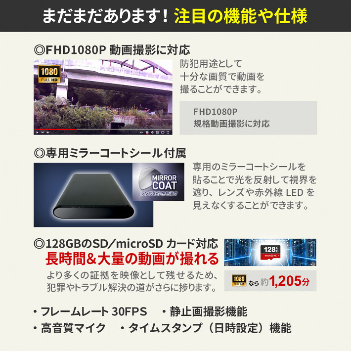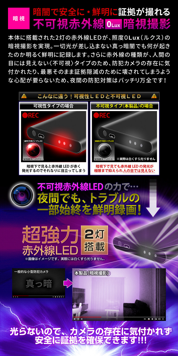 暗闇で進化を発揮する不可視タイプの赤外線暗視機能を搭載し、かつ単体で17時間録画可能なので、夜通し撮影もOK!