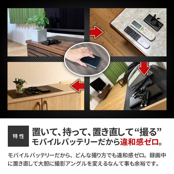 机上やベッド等、どこに置いてもまったく違和感のないモバイルバッテリー型ビデオカメラ。