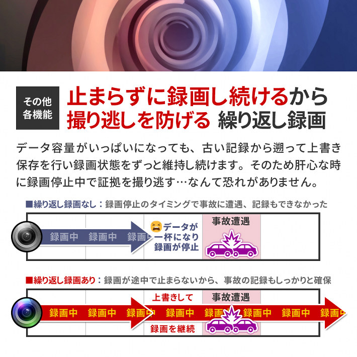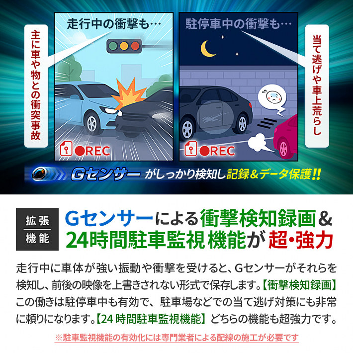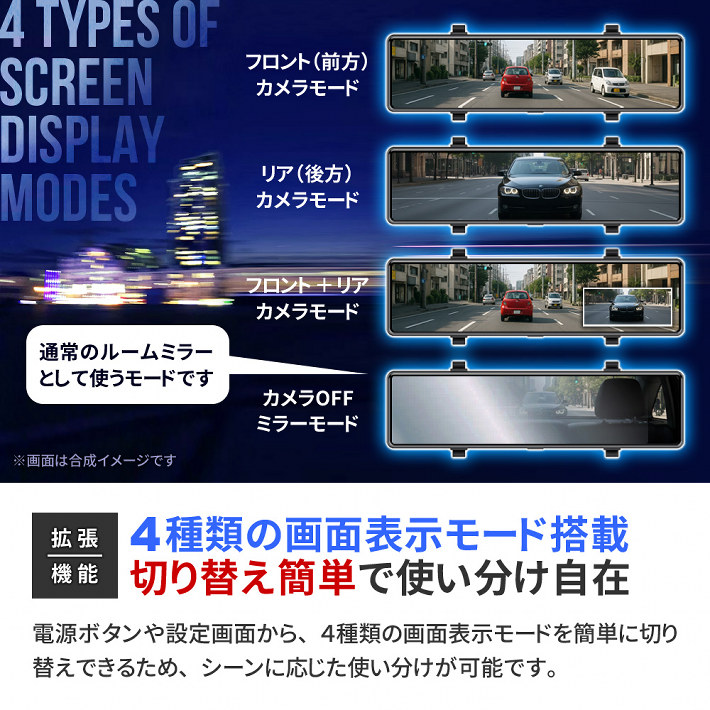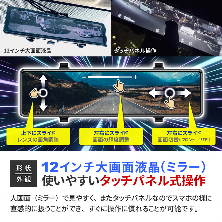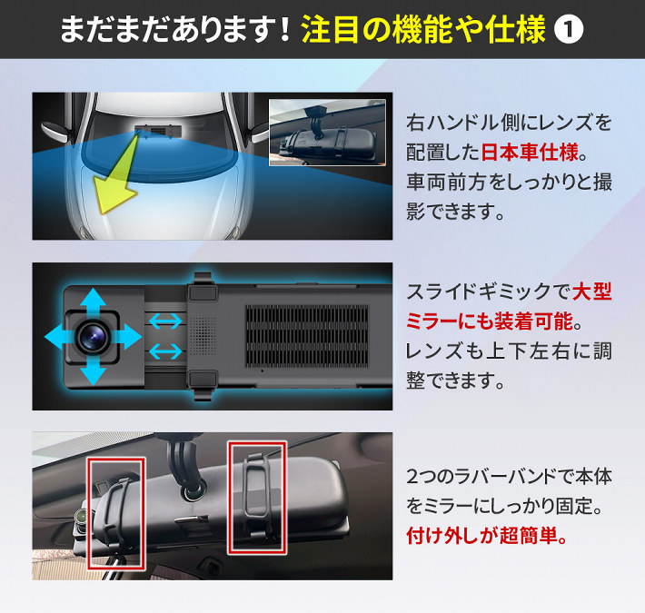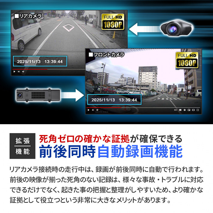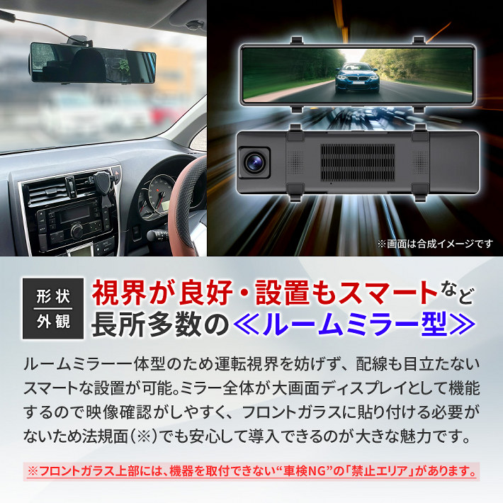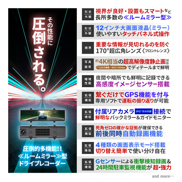 ミラー型ドライブレコーダー「GPS機能/リアカメラ付属!前後同時録画/Gセンサー機能」
